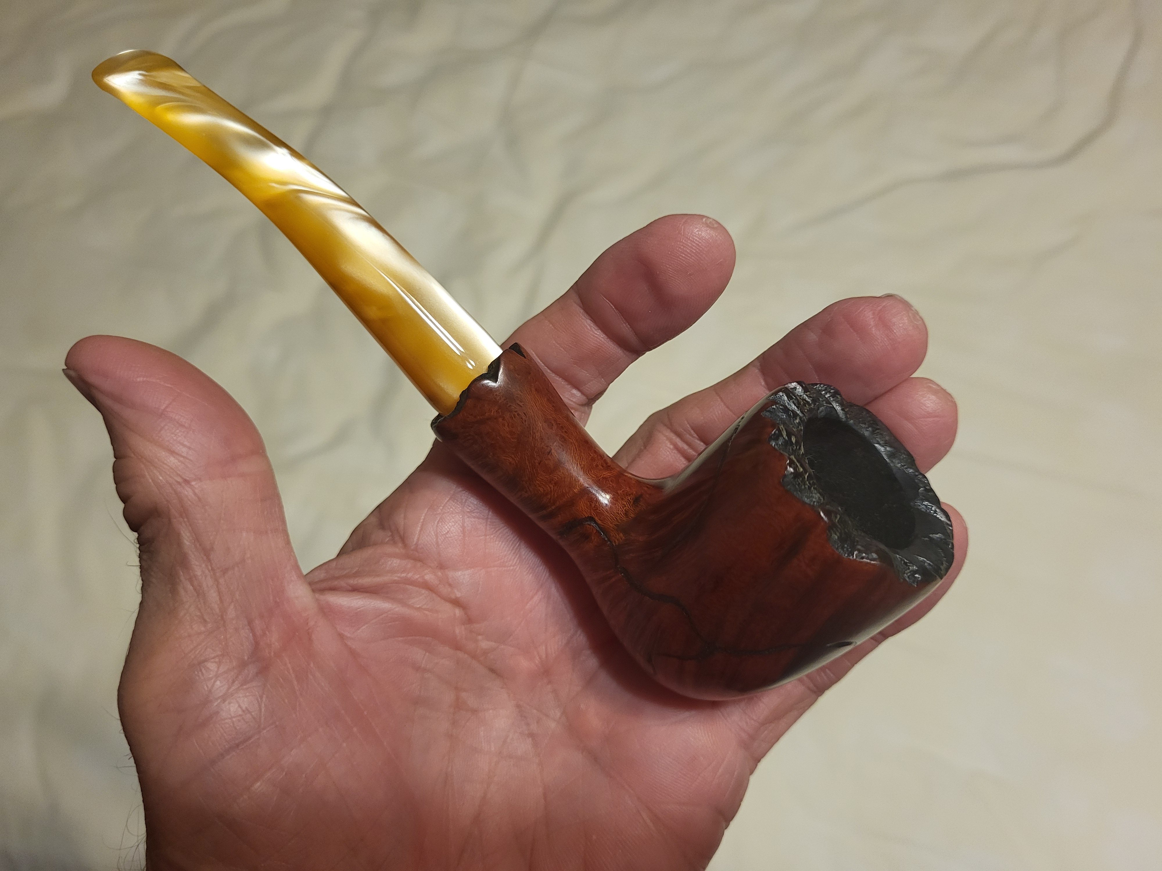 I recently restemmed this stummel with a gray lucite stem... didn't like it, it just wasn't working for me. So fitted an off red lucite stem that I think works better...